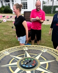 Time to take a seat at the round table! Teams choose two tarot cards—one revealing a protective cloak or the dreaded dagger! Without seeing each other’s selections, they swap cards. The player who ends up with the Dagger card loses a life. However, you have a chance at redemption by gambling for resurrection on the bagatelle board!